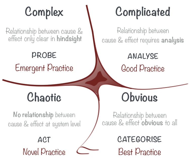 - Complex: Unknown unknowns, cause and effect only understood in retrospect